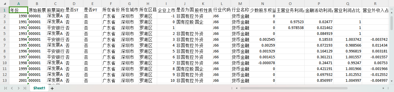 年份 原始股票代码 股票简称 是否ST 是否PT 所在省份-注册地详细 所在城市-注册地详细 所在区县-注册地详细 企业上市年龄 是否为国有控股-依据实际控制人性质筛选-股东子库 股权性质 行业代码C-治理结构子库 行业名称C-治理结构子库 少数股东权益占比 主营业务利润占比 金融活动利润占比 营业利润占比 营业外收入占比 流转税率 综合税率A 综合税率B 所得税率 归属于母公司净利润占比