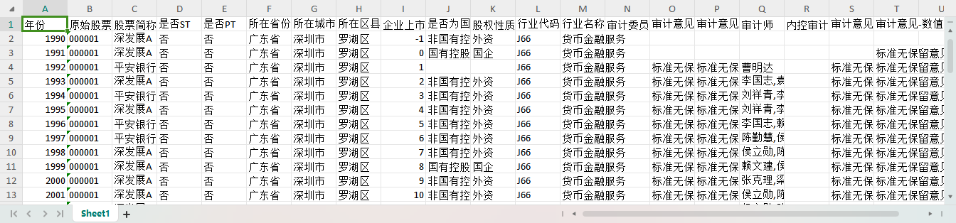 年份 原始股票代码 股票简称 是否ST 是否PT 所在省份-注册地详细 所在城市-注册地详细 所在区县-注册地详细 企业上市年龄 是否为国有控股-依据实际控制人性质筛选-股东子库 股权性质 行业代码C-治理结构子库 行业名称C-治理结构子库 审计委员会召开次数 审计意见类型-字符串 审计意见类型-数值型 审计师 内控审计意见 审计意见-字符串-上市公司贷款子库 审计意见-数值型-上市公司贷款子库