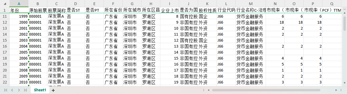 年份 原始股票代码 股票简称 是否ST 是否PT 所在省份-注册地详细 所在城市-注册地详细 所在区县-注册地详细 企业上市年龄 是否为国有控股-依据实际控制人性质筛选-股东子库 股权性质 行业代码C-治理结构子库 行业名称C-治理结构子库 市现率(PCF)1 市现率(PCF)2 市现率(PCF)TTM