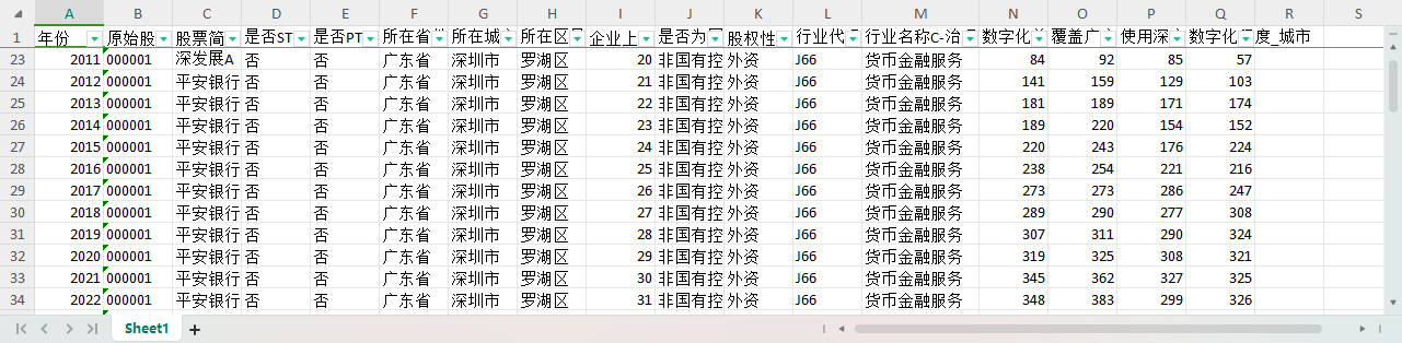 年份 原始股票代码 股票简称 是否ST 是否PT 所在省份-注册地详细 所在城市-注册地详细 所在区县-注册地详细 企业上市年龄 是否为国有控股-依据实际控制人性质筛选-股东子库 股权性质 行业代码C-治理结构子库 行业名称C-治理结构子库 数字化普惠金融综合指数_城市 覆盖广度_城市 使用深度_城市 数字化程度_城市