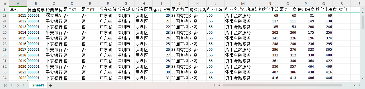 年份 原始股票代码 股票简称 是否ST 是否PT 所在省份-注册地详细 所在城市-注册地详细 所在区县-注册地详细 企业上市年龄 是否为国有控股-依据实际控制人性质筛选-股东子库 股权性质 行业代码C-治理结构子库 行业名称C-治理结构子库 数字化普惠金融综合指数_省份 覆盖广度_省份 使用深度_省份 数字化程度_省份