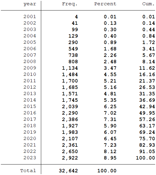样本选择:全部A股2001-2023年数据(“分析师预测指标文件”在数据库中是从2001-01-01开始,所以数据起点选择为2001年)