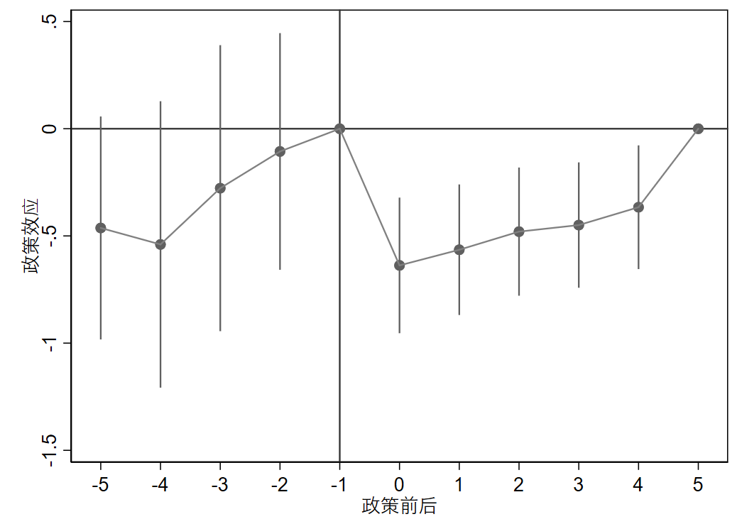 从图中来看,政策实施前(0点之前)的效应似乎有一定的波动,但总体趋势相对平稳,没有显著的上升或下降趋势。这个现象符合平行趋势假设的一部分,即在政策实施之前,效应变化是相对稳定的。