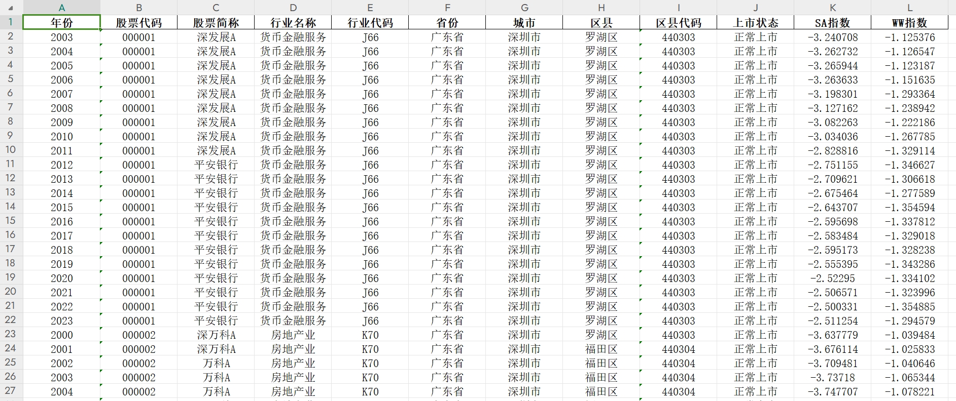 6万+融资约束指数-SA、WW指数数据【2000-20023年】