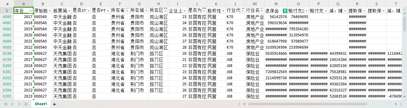 年份 原始股票代码 股票简称 是否ST 是否PT 所在省份-注册地详细 所在城市-注册地详细 所在区县-注册地详细 企业上市年龄 是否为国有控股-依据实际控制人性质筛选-股东子库 股权性质 行业代码C-治理结构子库 行业名称C-治理结构子库 退保金 赔付支出净额 赔付支出 减:摊回赔付支出 提取保险责任准备金净额 提取保险责任准备金 减:摊回保险责任准备金 保单红利支出 分保费用 减:摊回分保费用