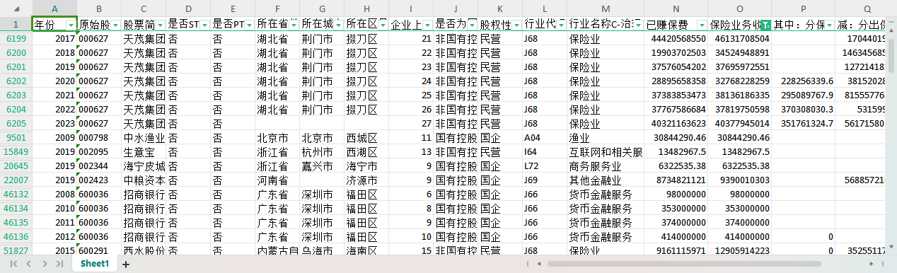 年份 原始股票代码 股票简称 是否ST 是否PT 所在省份-注册地详细 所在城市-注册地详细 所在区县-注册地详细 企业上市年龄 是否为国有控股-依据实际控制人性质筛选-股东子库 股权性质 行业代码C-治理结构子库 行业名称C-治理结构子库 已赚保费 保险业务收入 其中:分保费收入 减:分出保费 减:提取未到期责任准备金