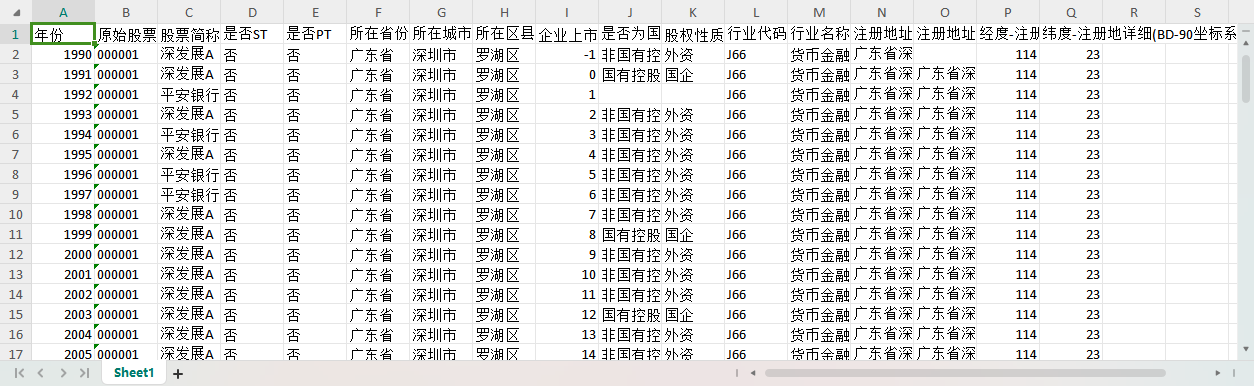上市公司1990-2023数据注册地址前后期补齐注册地址补齐原始经度纬度注册地详细BD-90坐标系