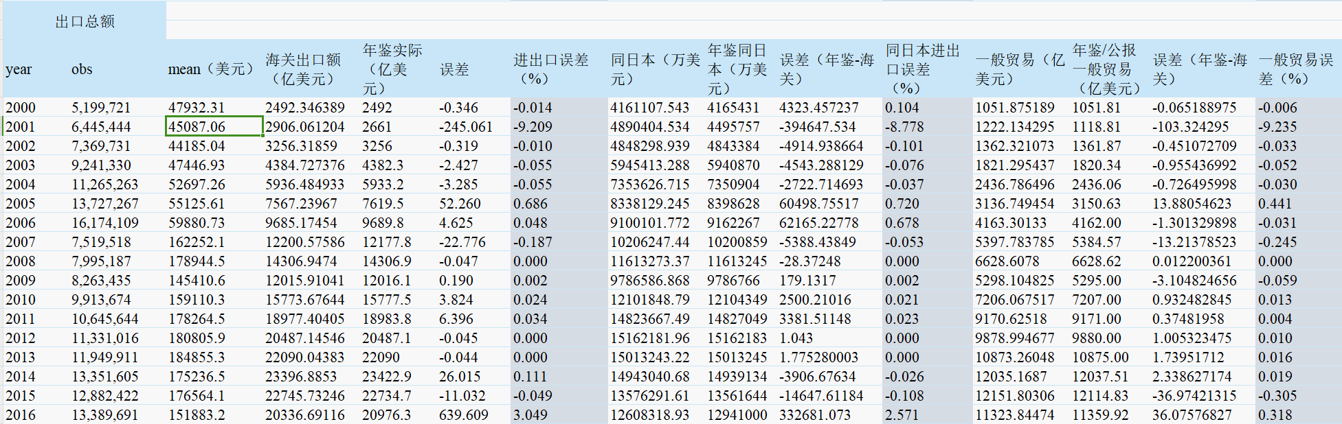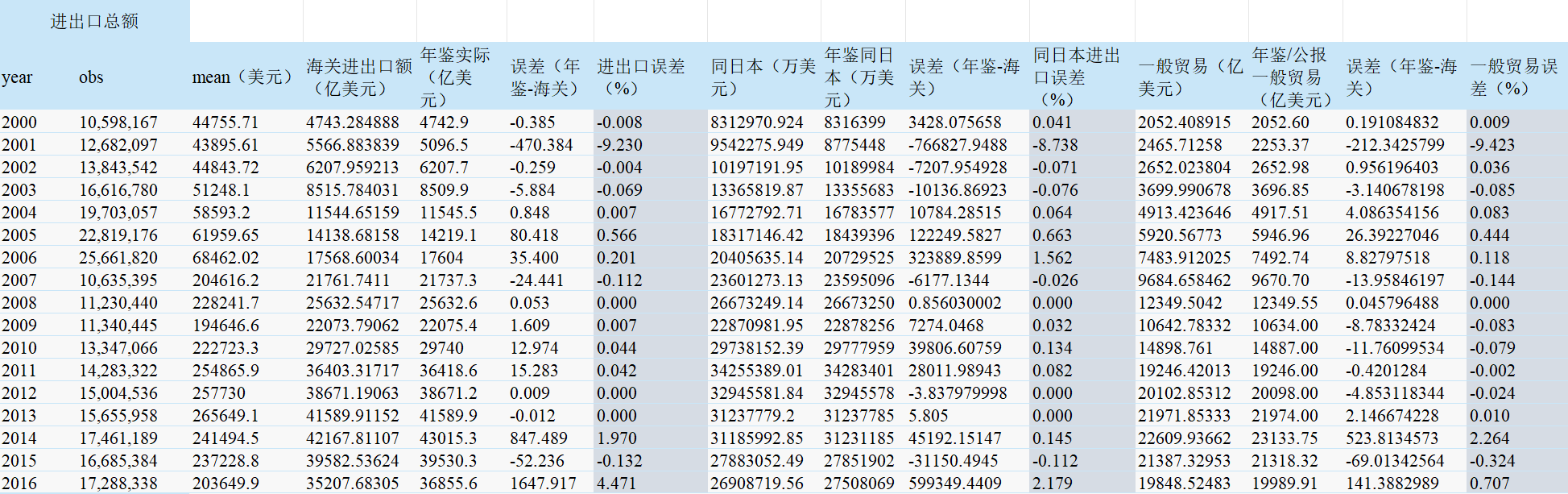 (1)检验总贸易额:将海关数据进出口总额以及出口总额与统计年鉴公布的数据做差,计算误差。