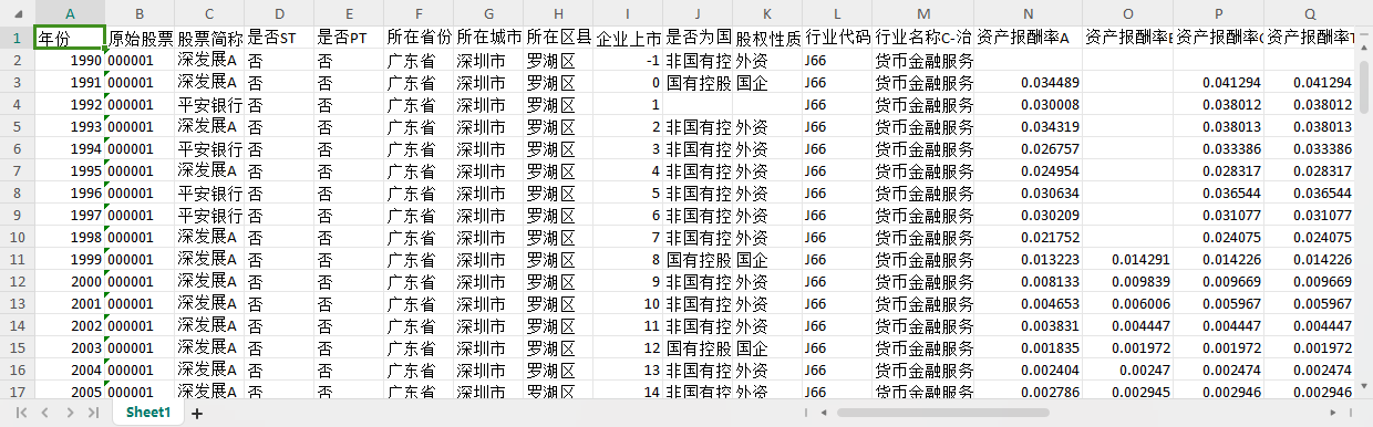 年份 原始股票代码 股票简称 是否ST 是否PT 所在省份-注册地详细 所在城市-注册地详细 所在区县-注册地详细 企业上市年龄 是否为国有控股-依据实际控制人性质筛选-股东子库 股权性质 行业代码C-治理结构子库 行业名称C-治理结构子库 资产报酬率A 资产报酬率B 资产报酬率C 资产报酬率TTM 总资产净利润率(ROA)A 总资产净利润率(ROA)B 总资产净利润率(ROA)C 总资产净利润率(ROA)TTM 流动资产净利润率A 流动资产净利润率B 流动资产净利润率C 流动资产净利润率TTM 固定资产净利润率A 固定资产净利润率B 固定资产净利润率C 固定资产净利润率TTM 净资产收益率(ROE)A 净资产收益率(ROE)B 净资产收益率(ROE)C 净资产收益率(ROE)TTM 息税前利润(EBIT) 息税前利润(EBIT)TTM 息前税后利润 息税折旧摊销前收入(EBITDA) 息税折旧摊销前收入(EBITDA)TTM 净利润与利润总额比