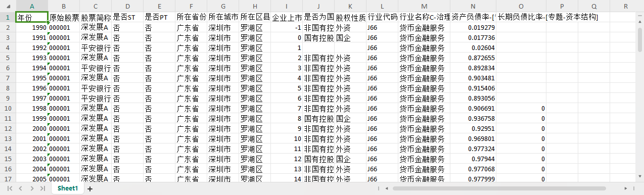年份 原始股票代码 股票简称 是否ST 是否PT 所在省份-注册地详细 所在城市-注册地详细 所在区县-注册地详细 企业上市年龄 是否为国有控股-依据实际控制人性质筛选-股东子库 股权性质 行业代码C-治理结构子库 行业名称C-治理结构子库 资产负债率-[专题-操控性与非操控性应计利润子库] 长期负债比率-[专题-资本结构]