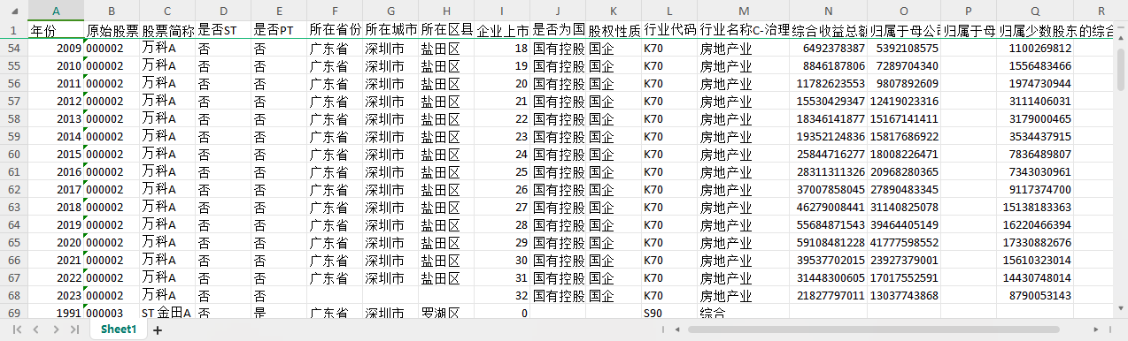 年份 原始股票代码 股票简称 是否ST 是否PT 所在省份-注册地详细 所在城市-注册地详细 所在区县-注册地详细 企业上市年龄 是否为国有控股-依据实际控制人性质筛选-股东子库 股权性质 行业代码C-治理结构子库 行业名称C-治理结构子库 综合收益总额 归属于母公司所有者的综合收益 归属于母公司其他权益工具持有者的综合收益总额 归属少数股东的综合收益