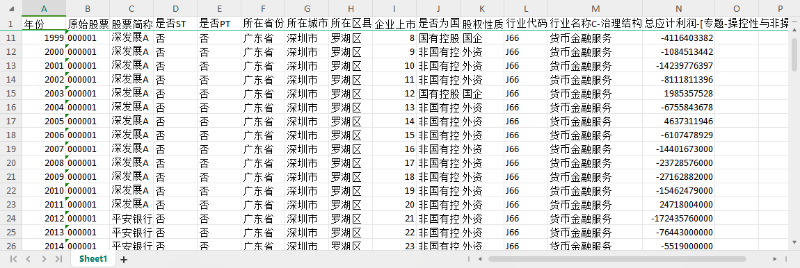 年份 原始股票代码 股票简称 是否ST 是否PT 所在省份-注册地详细 所在城市-注册地详细 所在区县-注册地详细 企业上市年龄 是否为国有控股-依据实际控制人性质筛选-股东子库 股权性质 行业代码C-治理结构子库 行业名称C-治理结构子库 总应计利润-[专题-操控性与非操控性应计利润子库]