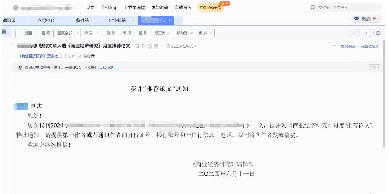 xu470879 发表于 2024-6-14 15:37 嘿嘿,刚刚有个超级好消息,我的论文被《商业经济研究》评为月度“推荐论文”了! 而且,你们猜怎么着?我 ...