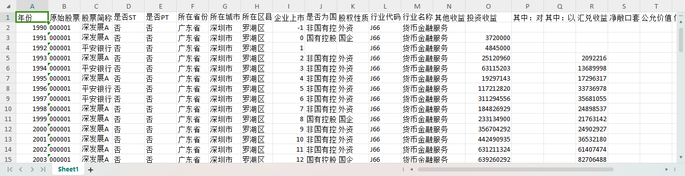 年份 原始股票代码 股票简称 是否ST 是否PT 所在省份-注册地详细 所在城市-注册地详细 所在区县-注册地详细 企业上市年龄 是否为国有控股-依据实际控制人性质筛选-股东子库 股权性质 行业代码C-治理结构子库 行业名称C-治理结构子库 其他收益 投资收益 其中:对联营企业和合营企业的投资收益 其中:以摊余成本计量的金融资产终止确认收益 汇兑收益 净敞口套期收益 公允价值变动收益 信用减值损失 资产处置收益 其他业务利润 营业利润