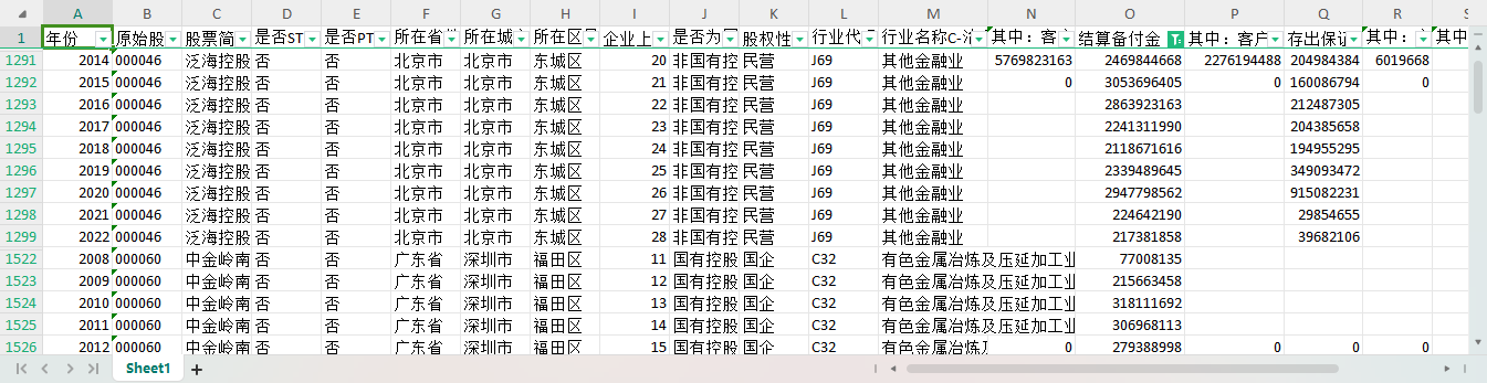 年份 原始股票代码 股票简称 是否ST 是否PT 所在省份-注册地详细 所在城市-注册地详细 所在区县-注册地详细 企业上市年龄 是否为国有控股-依据实际控制人性质筛选-股东子库 股权性质 行业代码C-治理结构子库 行业名称C-治理结构子库 其中:客户资金存款 结算备付金 其中:客户备付金 存出保证金 其中:交易席位费 其中:质押借款 代理买卖证券款 代理承销证券款 独立账户负债