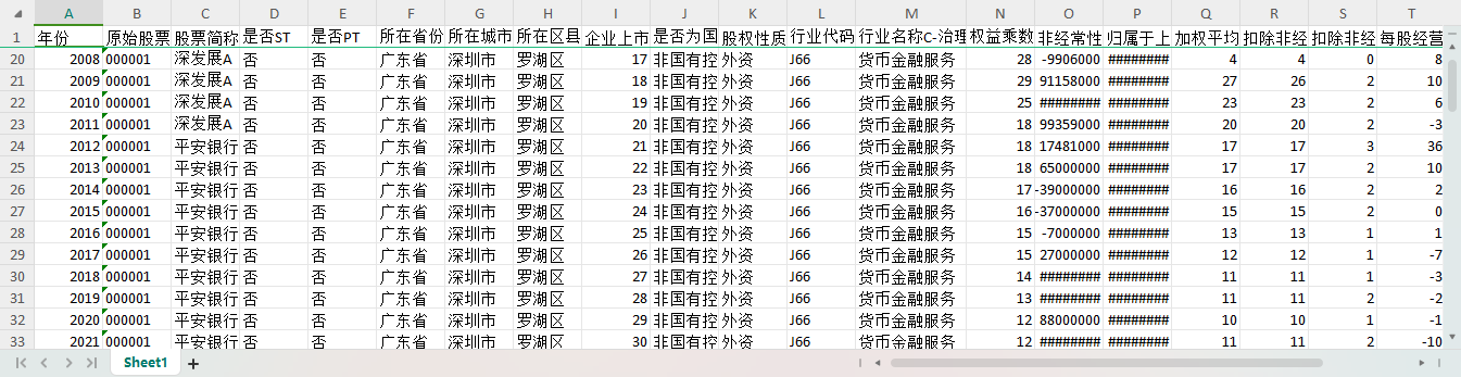 年份 原始股票代码 股票简称 是否ST 是否PT 所在省份-注册地详细 所在城市-注册地详细 所在区县-注册地详细 企业上市年龄 是否为国有控股-依据实际控制人性质筛选-股东子库 股权性质 行业代码C-治理结构子库 行业名称C-治理结构子库 权益乘数2 非经常性损益 归属于上市公司股东的扣除非经常性损益的净利润 加权平均净资产收益率 扣除非经常性损益后的加权平均净资产收益率 扣除非经常性损益后的基本每股收益 每股经营活动产生的现金流量净额 归属于上市公司股东的每股净资产 基本每股收益 稀释每股收益