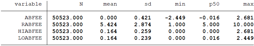同时设计两个独立变量,正向异常审计费用(HIABFEE) 和负向异常审计费用(LOABFEE),分别表示偏高和偏低的异常审计费用,从两个方向研究异常审计费用和审计质量的关系。当ABFEE>0时,HIABFEE=ABFEE,否则为0;当 ABFEE<0时,LOABFEE=|ABFEE|,否则为0。
