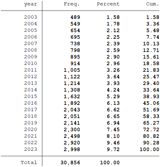 样本选择:全部A股2003-2023年数据(初始数据的起点为1998年,经过处理之后的数据起点为2003年)