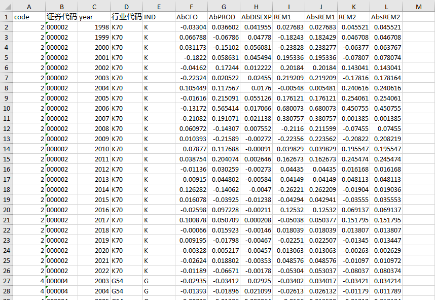 分年度分行业对上述模型进行估计,其残差分别为当年的异常经营现金净流量(AbCFO)、异常生产成本(AbPROD)和异常酌量性费用(AbDISEXP)。