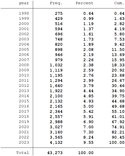 样本选择:全部A股1998-2023年数据(“经营活动产生的现金流量净额”数据是从1998年开始,所以数据起点选择为1998年)