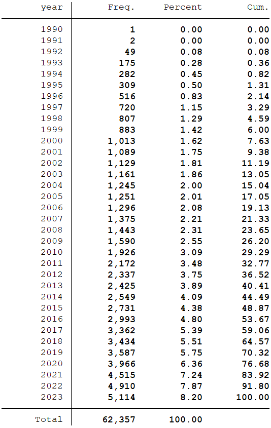 分年份数据量统计(控制变量剔除和缩尾版本):