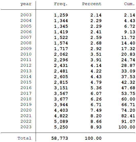 样本选择:全部A股2003-2023年数据(“海外业务收入”在数据库中的初始数据是从2003年开始,所以数据起点选择为2003年)