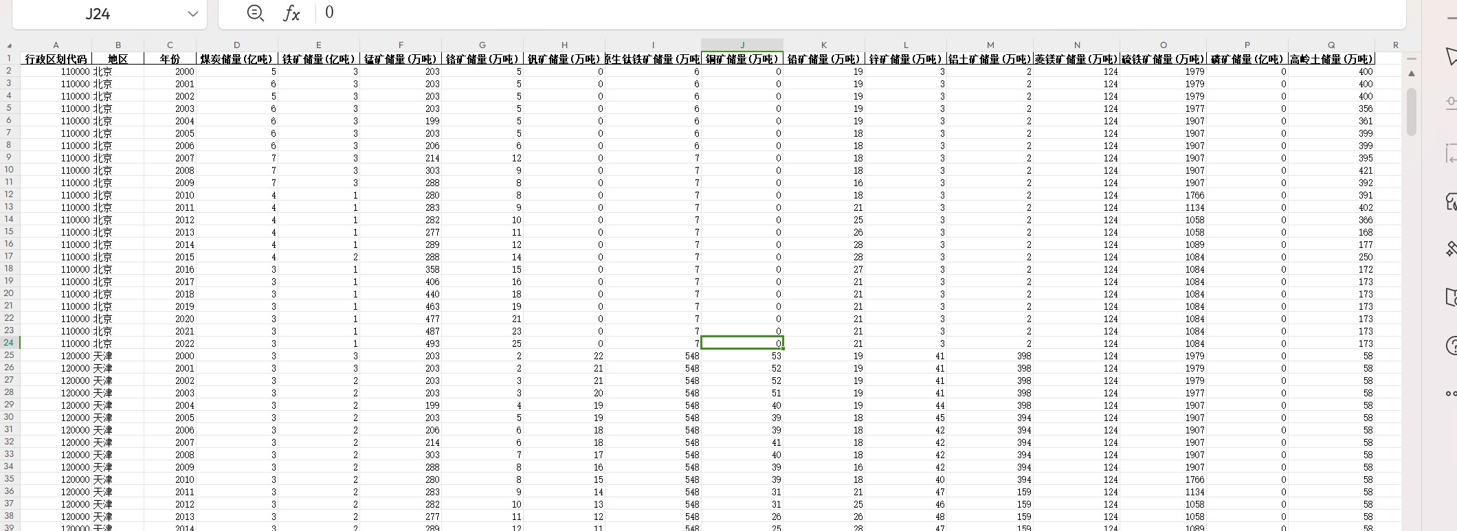 指标包括:行政区划代码 地区 年份 煤炭储量(亿吨) 铁矿储量(亿吨) 锰矿储量(万吨) 铬矿储量(万吨) 钒矿储量(万吨) 原生钛铁矿储量(万吨) 铜矿储量(万吨) 铅矿储量(万吨) 锌矿储量(万吨) 铝土矿储量(万吨) 菱镁矿储量(万吨) 硫铁矿储量(万吨) 磷矿储量(亿吨) 高岭土储量(万吨)