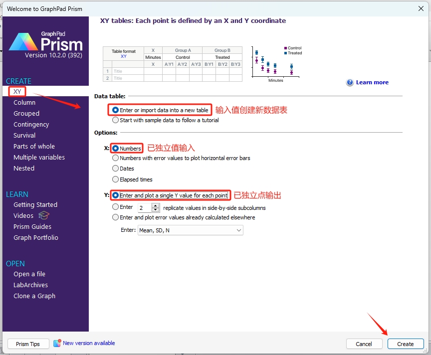 1.打开GraphPad Prism软件,如下所示,选择XY数据类型