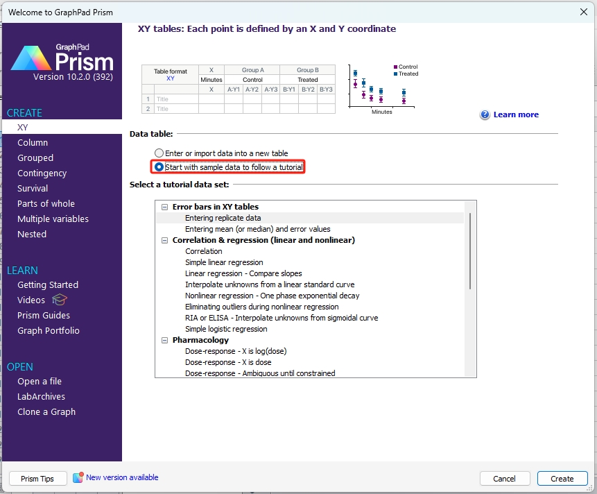 Data table如果选择Start with sample data to follow a tutorial:用软件自带的示例数据,对应出现的是Select a tutorial data set,包含适合于XY数据类型的各种分析