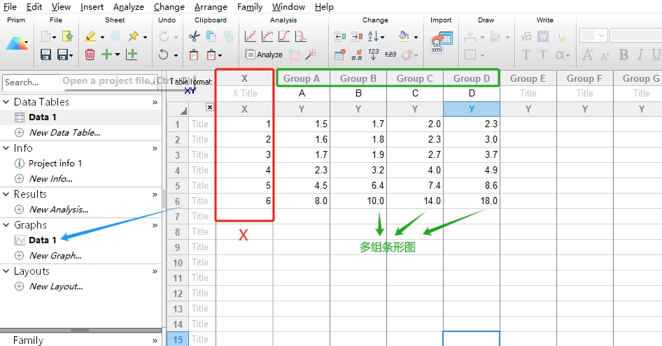 Data table选项如果选择Enter or import data into a new table:在新建表中输入数据(一般分析自己的数据的时候选择),对应的出现Options选项下X和Y的各种选项。