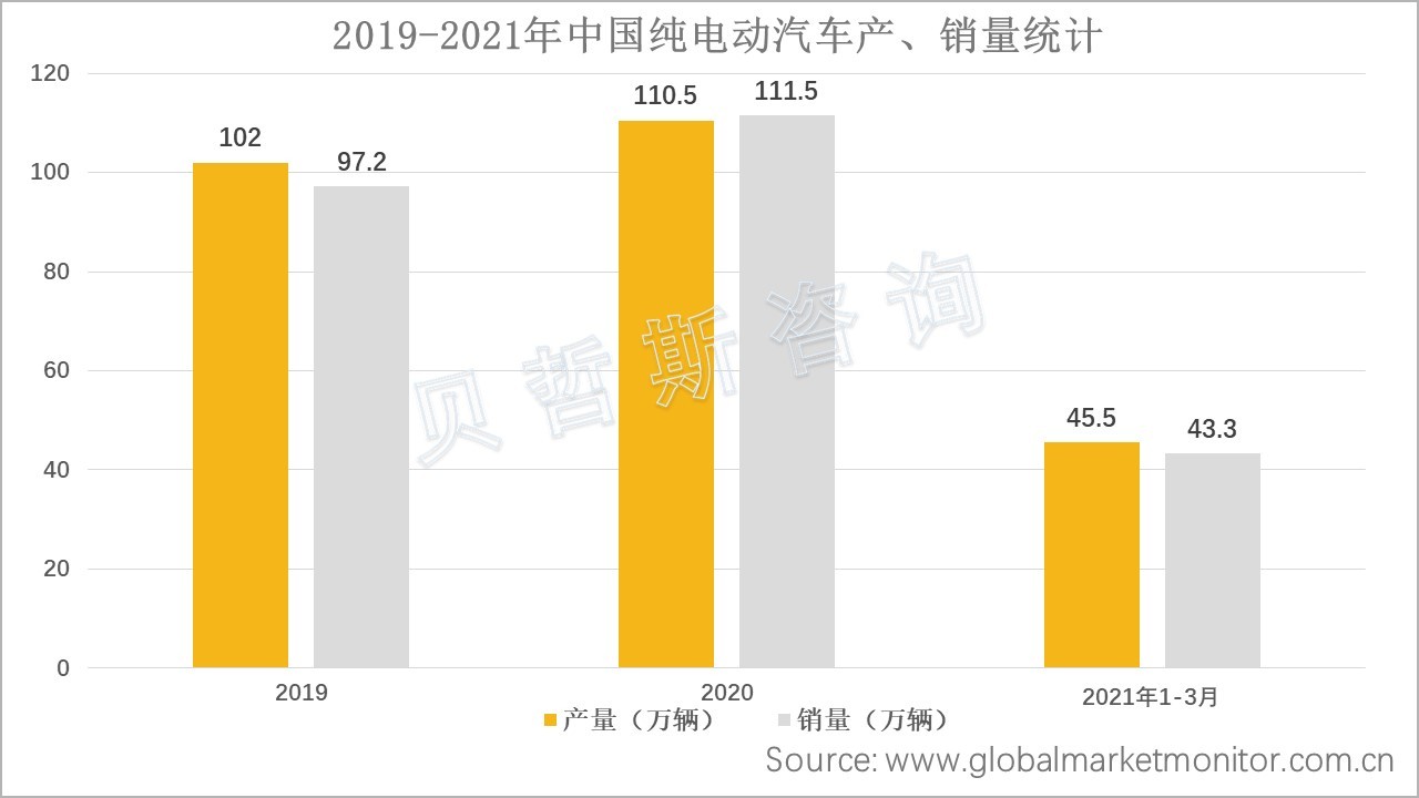 据中国汽车工业协会的统计数据显示,2019年,中国纯电动汽车产销量分别为102万辆和97.2万辆,产量同比增长3.4%,销量同比下降1.2%。2020年,市场继续升温,全年产量为110.5万辆,同比增长8.33%;而销量高达111.5万辆,同比增长14.71%,国内市场一度出现供不应求的情况。2021年,截止至3月份,中国纯电动汽车产销分别已完成45.5万辆及43.3万辆,市场发展势头良好。