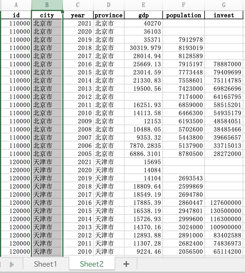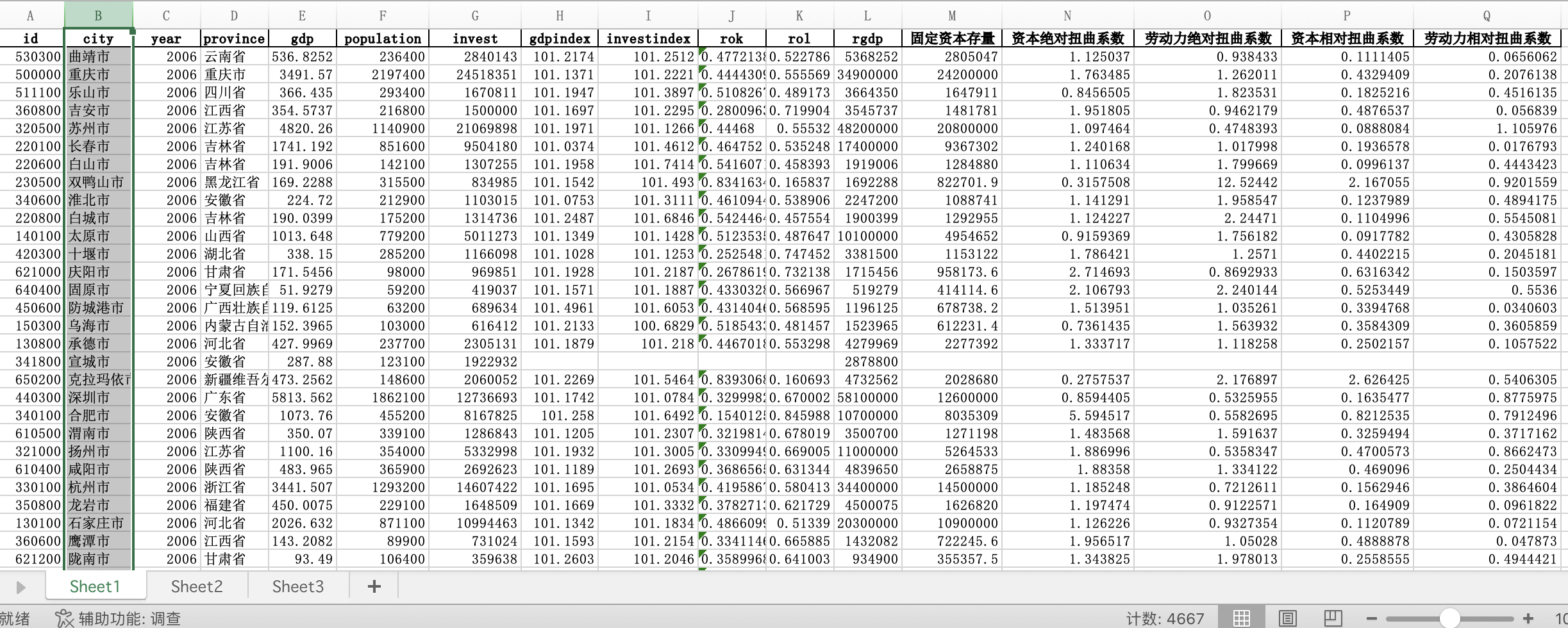 共计17个指标:id、year、rok、rol、city、province、gdp、population、invest、gdpindex、investindex、rgdp、capital、gammak、gammal、abstauk、abstaul