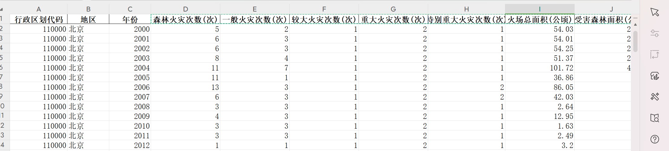 指标包括:森林火灾次数(次) 一般火灾次数(次) 较大火灾次数(次) 重大火灾次数(次) 特别重大火灾次数(次) 火场总面积(公顷) 受害森林面积(公顷) 天然林受害面积(公顷) 人工林受害面积(公顷) 森林火灾伤亡人数(人) 森林火灾死亡人数(人) 森林火灾其他损失折款(万元)