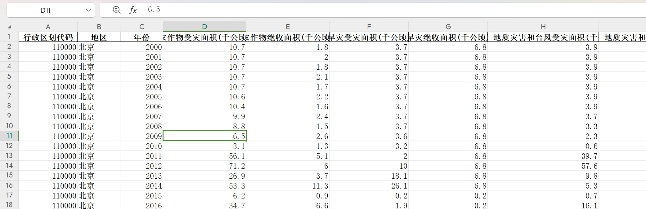 指标包括:农作物受灾面积(千公顷) 农作物绝收面积(千公顷) 旱灾受灾面积(千公顷) 旱灾绝收面积(千公顷) 洪涝、地质灾害和台风受灾面积(千公顷) 洪涝、地质灾害和台风绝收面积(千公顷) 风雹灾害受灾面积(千公顷) 风雹灾害绝收面积(千公顷) 低温冷冻和雪灾受灾面积(千公顷) 低温冷冻和雪灾绝收面积(千公顷) 自然灾害受灾人口(万人次) 自然灾害受灾死亡人口(人) 自然灾害直接经济损失(亿元) 发生地质灾害起数(次) 发生滑坡灾害起数(次)