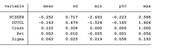 二是采用收益率上下波动比率(DUVOL)度量股价崩盘风险。 对于每个公司、年度,首先定义特质收益率小于均值的周为下跌周,特质收益率高于均值的周为上涨周。然后分别计算出下跌周和上涨周特质收益率的标准差,得出下跌波动率和上涨波动率。 最后,以下跌波动率除以上涨波动率并 取自然对数,即得到每一个公司、年度样本的 DUVOL 指标。 计算公式如下: