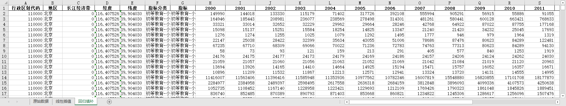 excel数据文件包原始数据(由于多年度指标不同存在缺失值)、线性插值、ARIMA填补三个版本,提供您参考使用。