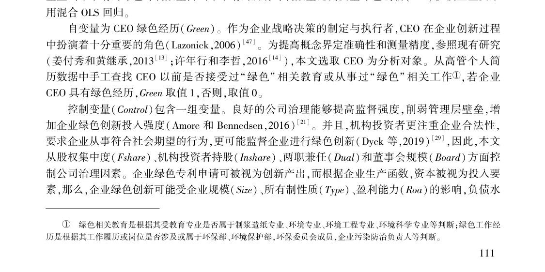 卢建词,姜广省.CEO绿色经历能否促进企业绿色创新?[J].经济管理,2022,44(02):106-121.DOI:10.19616/j.cnki.bmj.2022.02.007.
