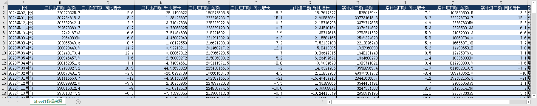 中国海关进出口增减数据2008-2024月度进口出口额同比环比增减%.zip