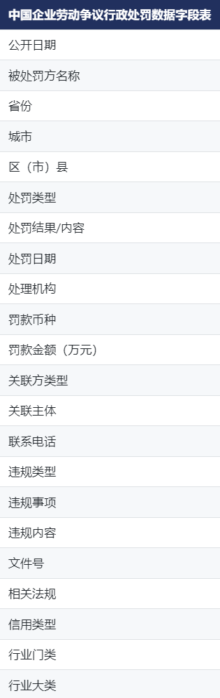 CnOpenData整理了我国近年来的企业劳动争议行政处罚信息,包含企业名称、处罚日期、处罚事由、处罚单位等字段,为相关研究助力。