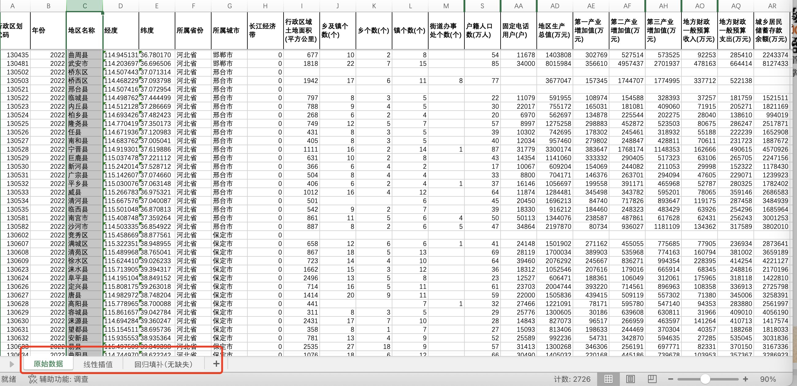 数据名称:中国县域统计年鉴2022数据全国2726区县GDP一二三产业增加值人口财政收入支出(无缺失值填补版)