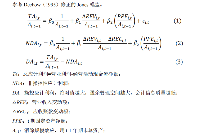 公式(1)进行分行业分年度回归,得到回归系数带入公式(2)得到不可操控应计利润 NDA,然后在带入公式(3),得到修正的可操控应计利润 DA。制造业“C”字头代码取 2 位,其他行业取 1 位,进行行业分类,在计算中剔除行业分类后样本数少于 10 个以及相关数据缺失的样本。