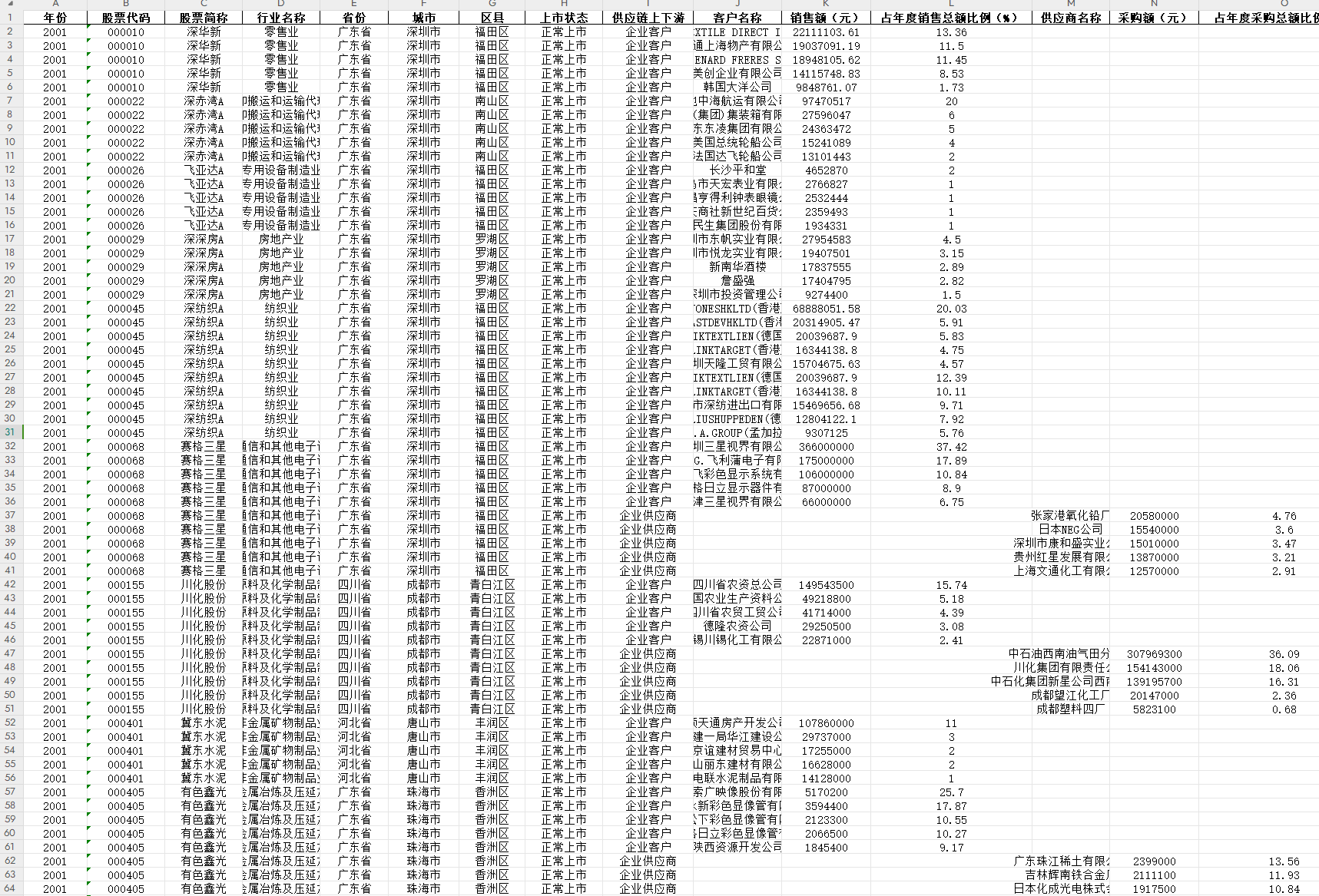 上市公司历年供应商和客户明细数据,包括公司与各供应商和客户之间的采购与销售统计。该数由上市年报公开,反映了公司的供应链管理和市场需求状况。通过分析供应商和客户数据,研究人员可以评估公司的供应链稳定性、依赖度和客户基础,了解其业务运营的广度和深度。此外,这些数据为企业供应链相关研究提供依据