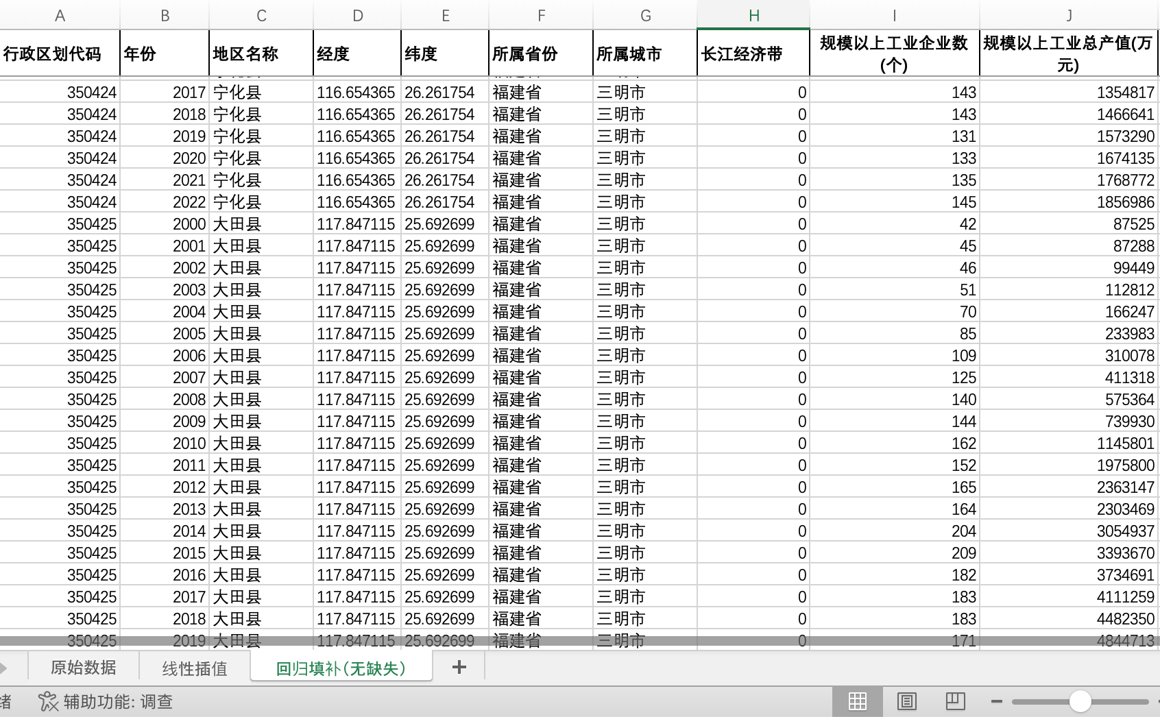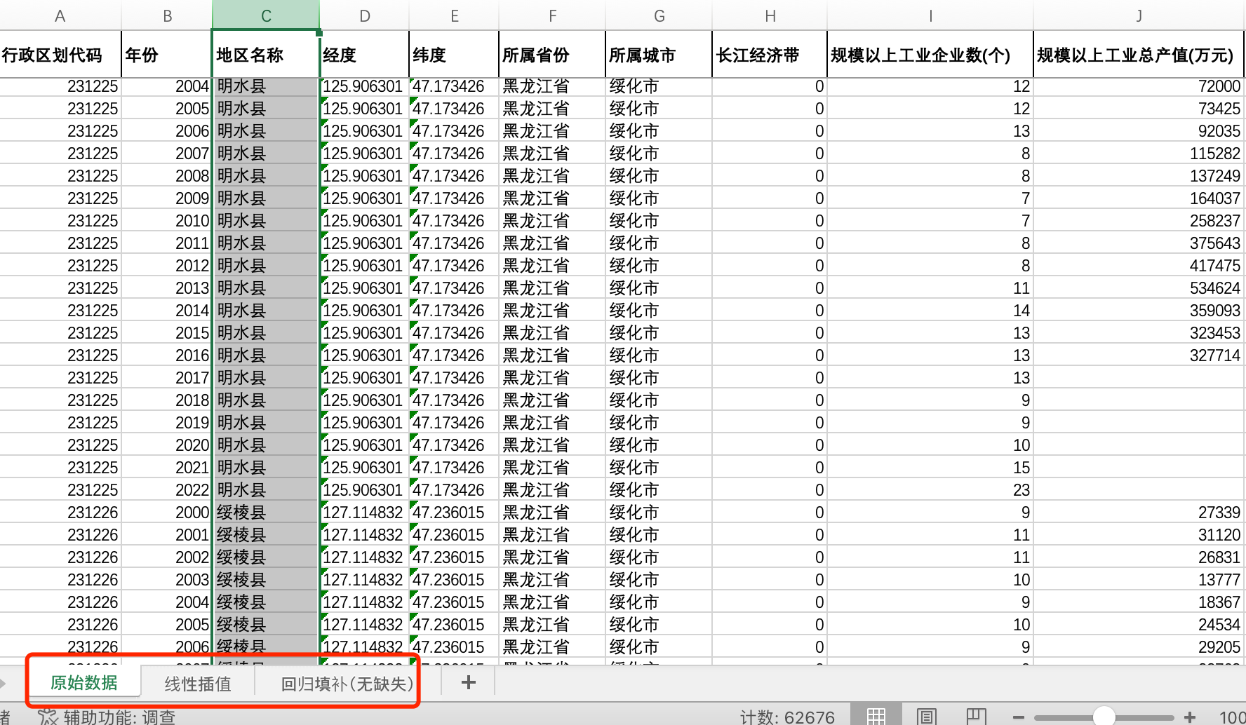 原始数据中,规模以上工业企业数、规模以上工业总产值,两指标有数据区县占比73%,缺失值27%。已属于比较齐全版本,介意勿拍行政区划代码 |