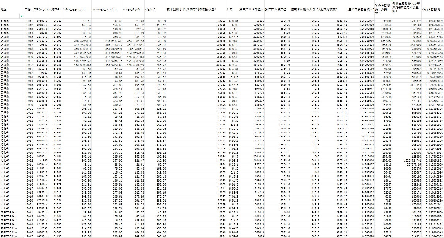 因为课程论文需要,整理了2011年到2022年全国31省市的普惠金融及其他数据,包括各省人均GDP,数字金融普惠指数,数字金融覆盖广度、数字金融使用深度、数字化程度、国内专利申请授权量、外商直接投资额、对外直接投资额、汇率、进出口贸易总额、地方财政支出、城镇单位就业人数等