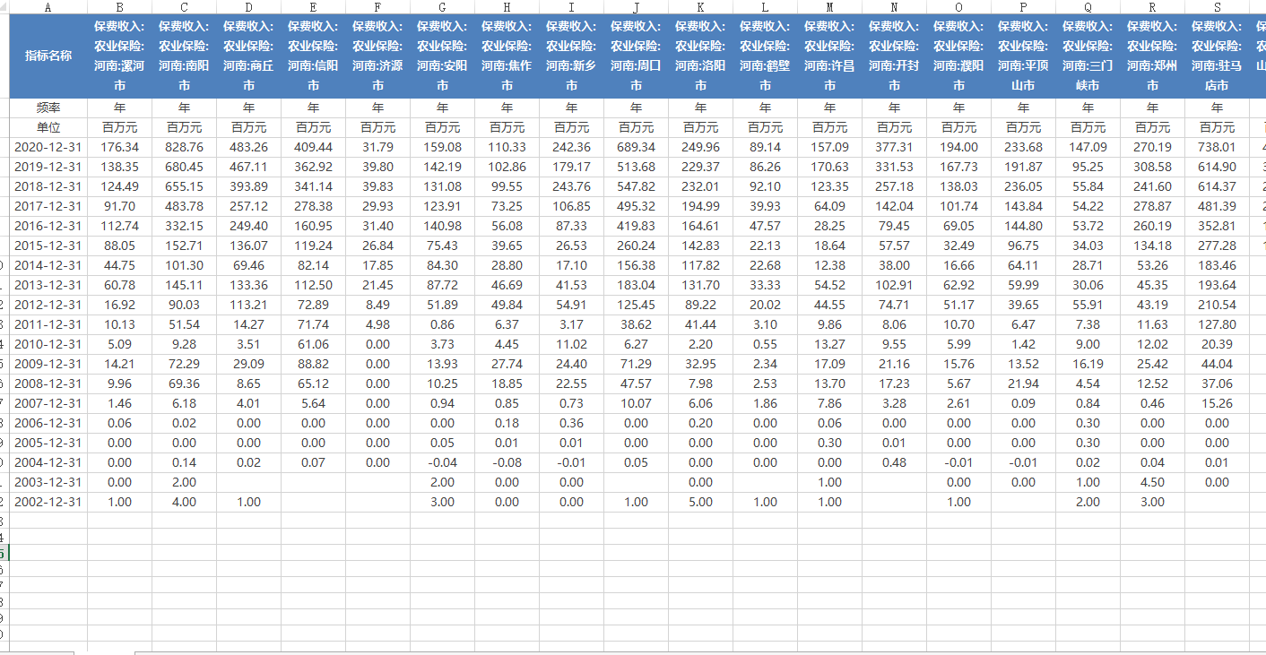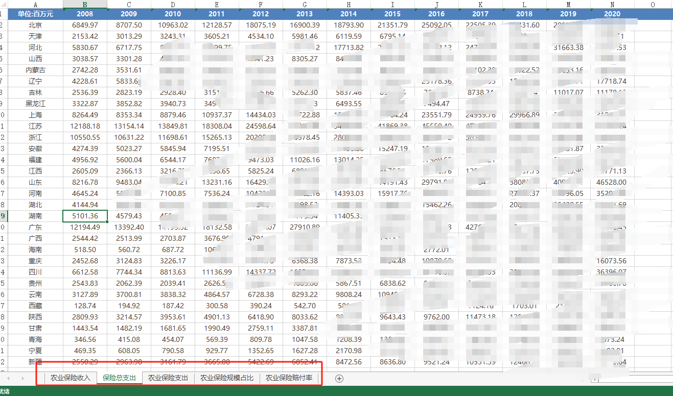 ①2008-2020年全国31省农业保险收入、农业保险支出、保险总支出、农业保险规模占比、农业保险赔付率五大类。