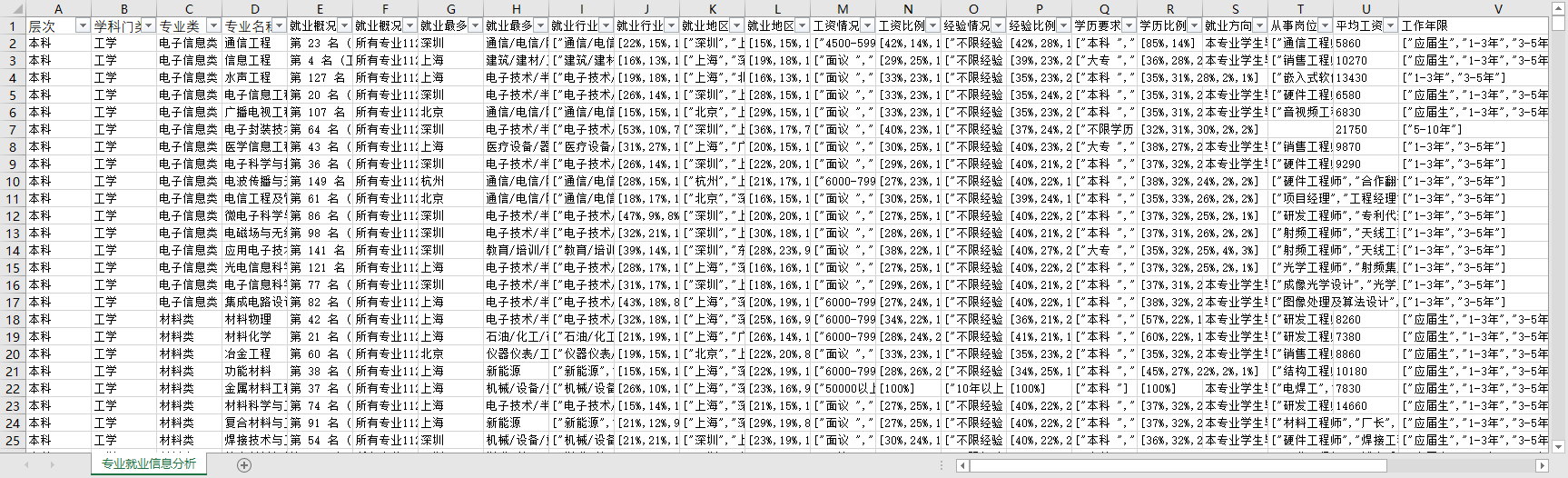 层次 学科门类 专业类 专业名称 就业概况-名次 就业概况-名次-描述 就业最多地区 就业最多行业 就业行业分布 就业行业分布比例 就业地区分布 就业地区分布比例 工资情况 工资比例 经验情况 经验比例 学历要求 学历比例 就业方向 从事岗位 平均工资 工作年限 工作年限工资