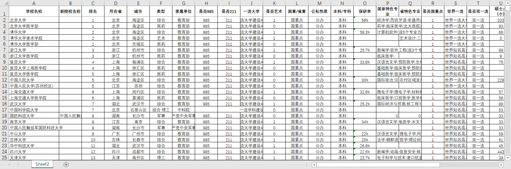 学校名称 新院校名称 排名 所在省 城市 类型 隶属单位 是否985 是否211 一流大学 是否艺术 国重/省重 公私性质 本科/专科 保研率 国家特色专业 省特色专业 是否国重点 世界一流 是否双一流 硕士点(个) 博士点(个) 成立时间 女生比例 男生比例 招办电话 电子邮箱 通讯地址 官网 评估结果 大学简介