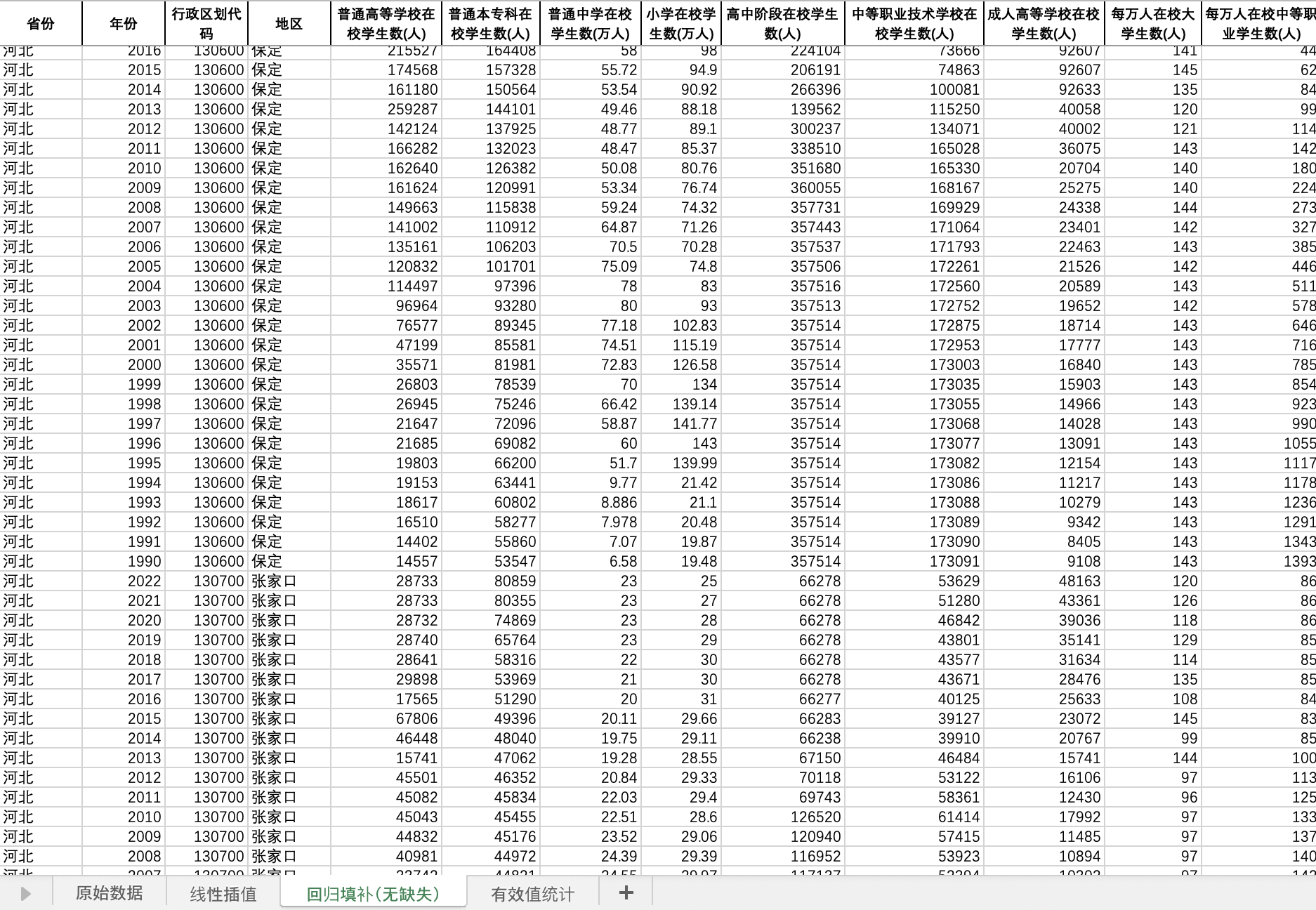 数据名称:全国各省300个地级市在校学生数普通高等学校在校学生数中学小学高中职业每万人学生数(插值填补无缺版)