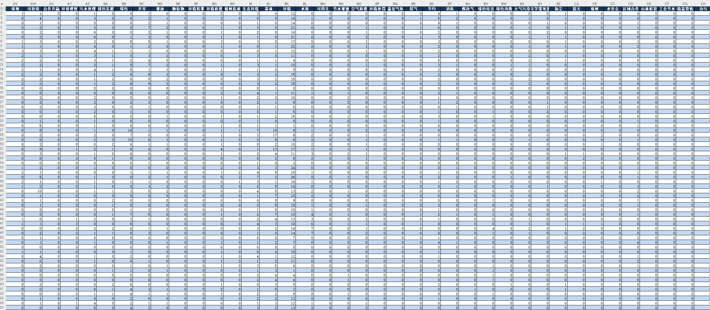 参考刘坚等老师的做法(2024),结合政府发布的有关绿色发展的会议报告,从中提取与绿色发展相关的关键词,形成绿色发展关注度词库,使用文本分析方法来获取政府工作报告中绿色发展关键词的使用频率,以此衡量政府对绿色发展的关注程度