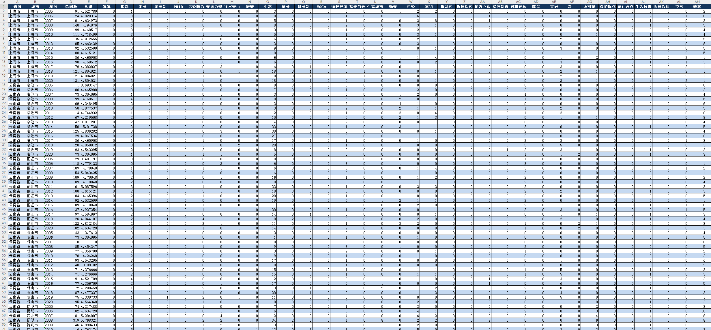省份 | 城市 | 年份 | 总词频 | 对数 |